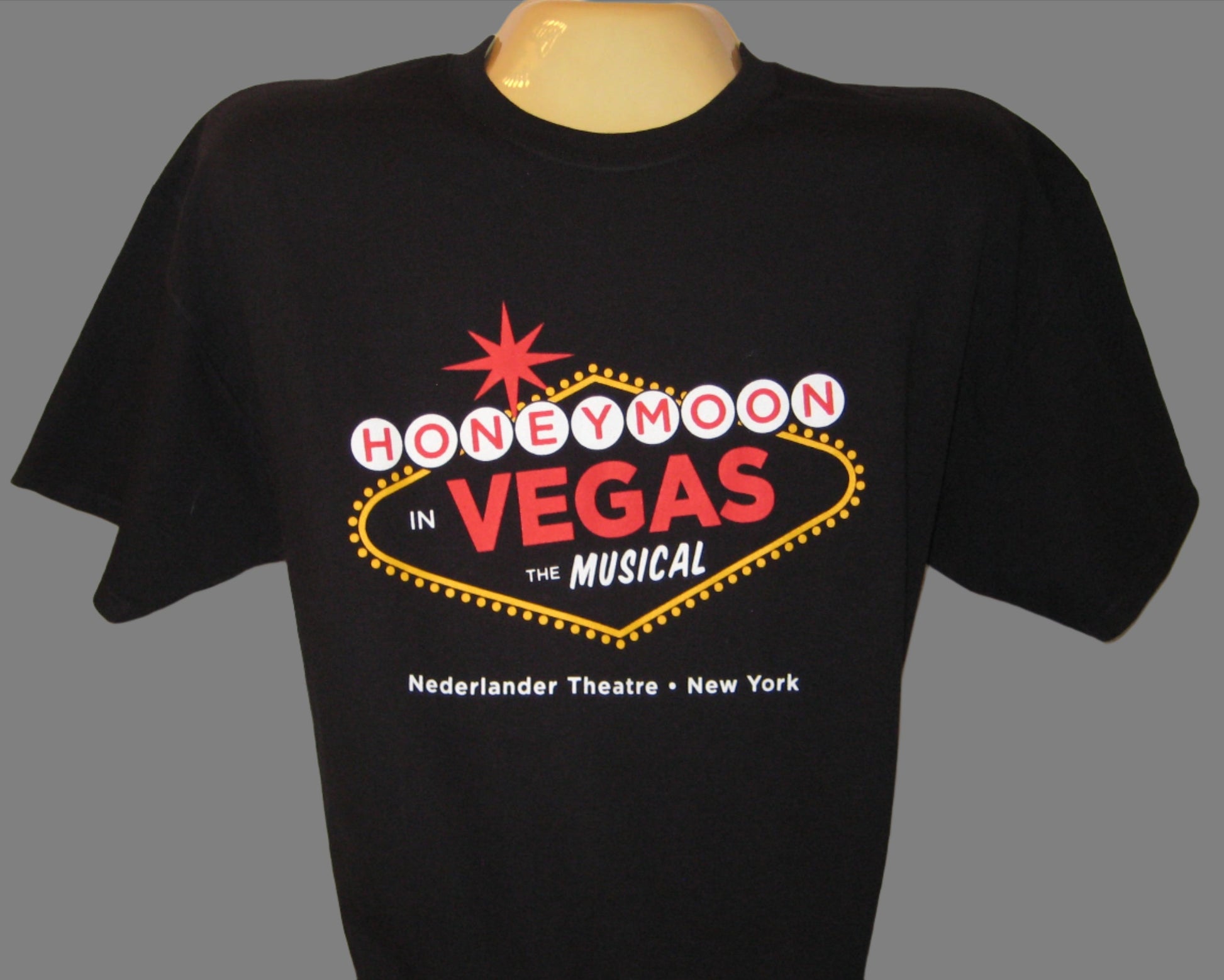 This Honeymoon In Vegas unisex fit t-shirt is made from 100% preshrunk cotton, which makes it comfortable to wear and keeps it from shrinking. The shirt has a crew neck, short sleeves, and a straight hem. It looks great and is suitable for all genders. The tee is from the production of the show at Nederlander Theatre * New York.
