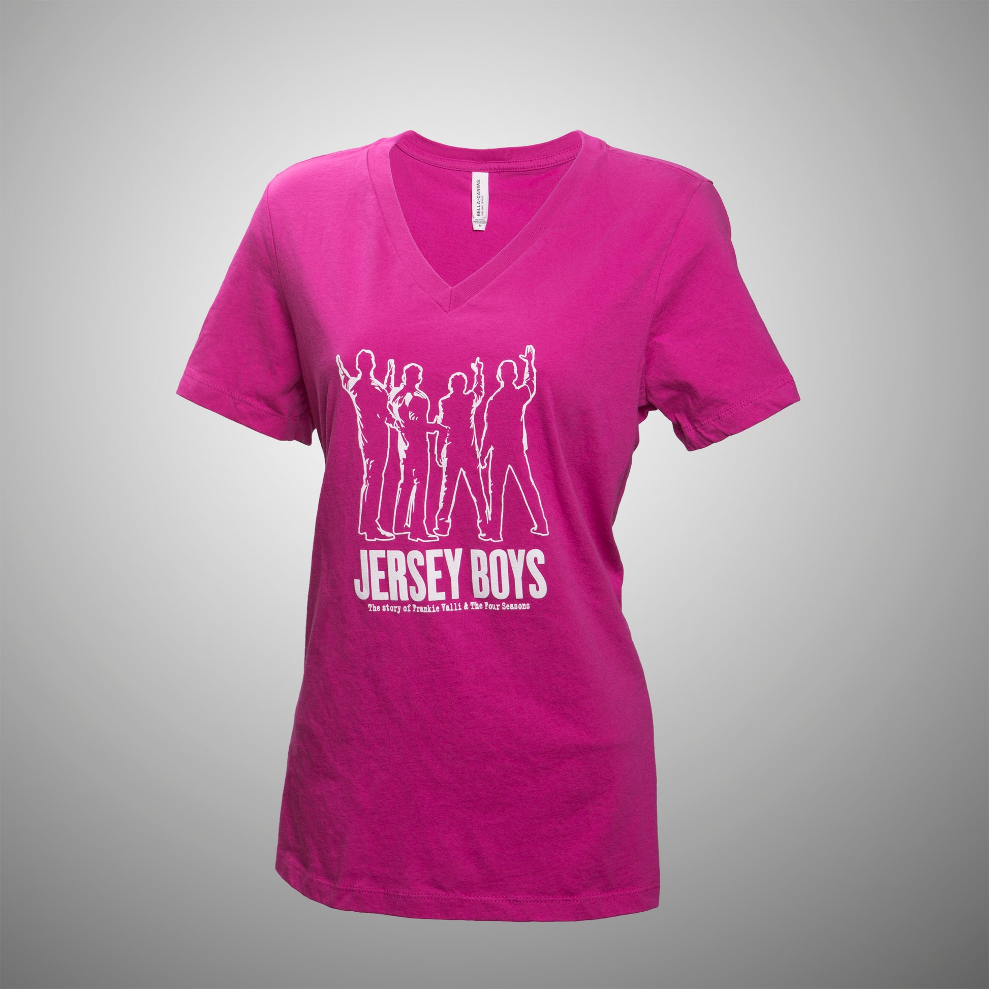 This is a ladies V Neck t shirt in the color Berry. It is made of 100% cotton and is a comfortable, lightweight shirt that is perfect for hot summer days. The shirt has the Jersey Boys logo on the front, which is a reference to the popular musical about the Four Seasons.