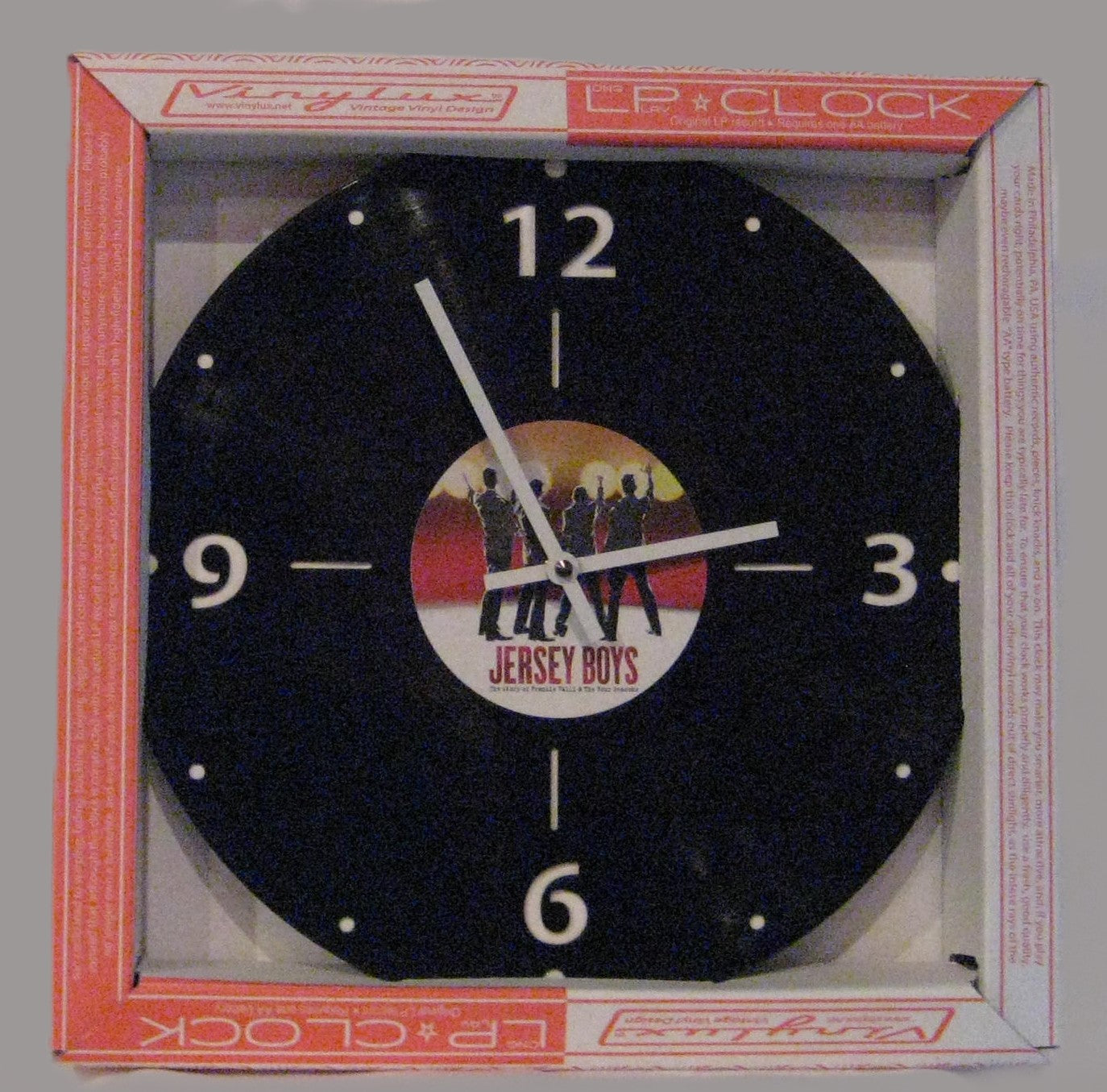 Keep time with the Jersey Boys! This clock is made from real vinyl records with the Jersey Boys logo in the middle. It's the perfect way to show your love of the Jersey Boys and their music!