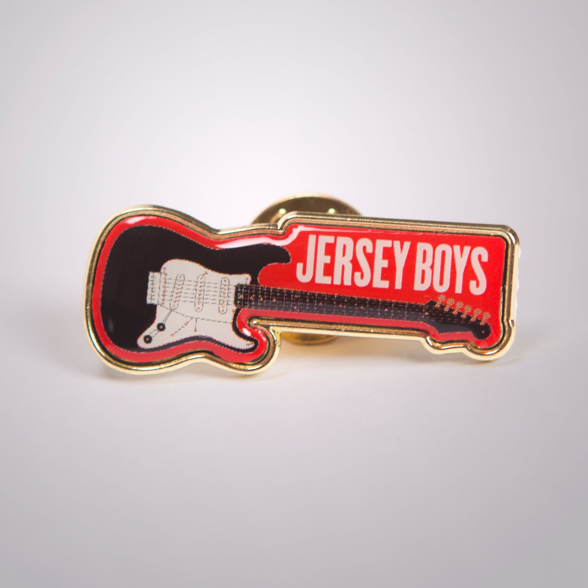 This pin is a collectible with a guitar & Jersey Boys logo. It is made of metal, has a glossy finish and a tie back clasp.