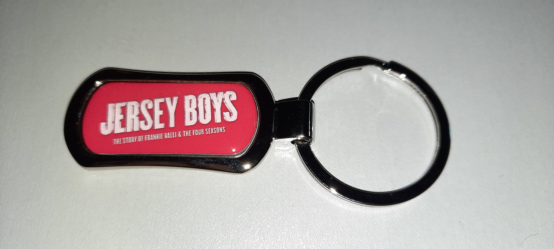 This keychain is a collectible from the Jersey Boys musical. It's a great way to show your love of the show! The keychain is made of metal and has a epoxy coating over the logo of the Jersey Boys musical.