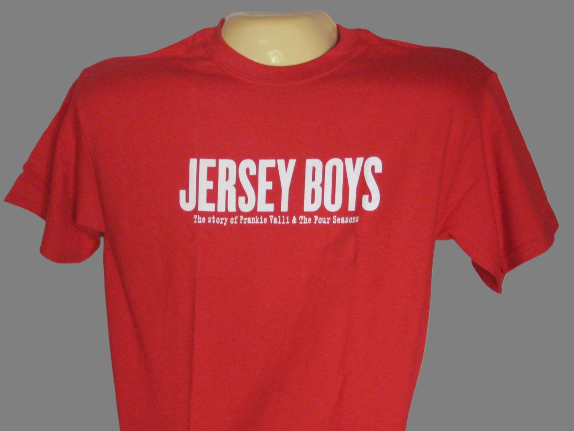 This red T-shirt from Jersey Boys is made of 100% cotton. It has a crew neck and short sleeves, which is a classic combination that is always in style. The fabric is soft and comfortable, and the shirt is well-made.
