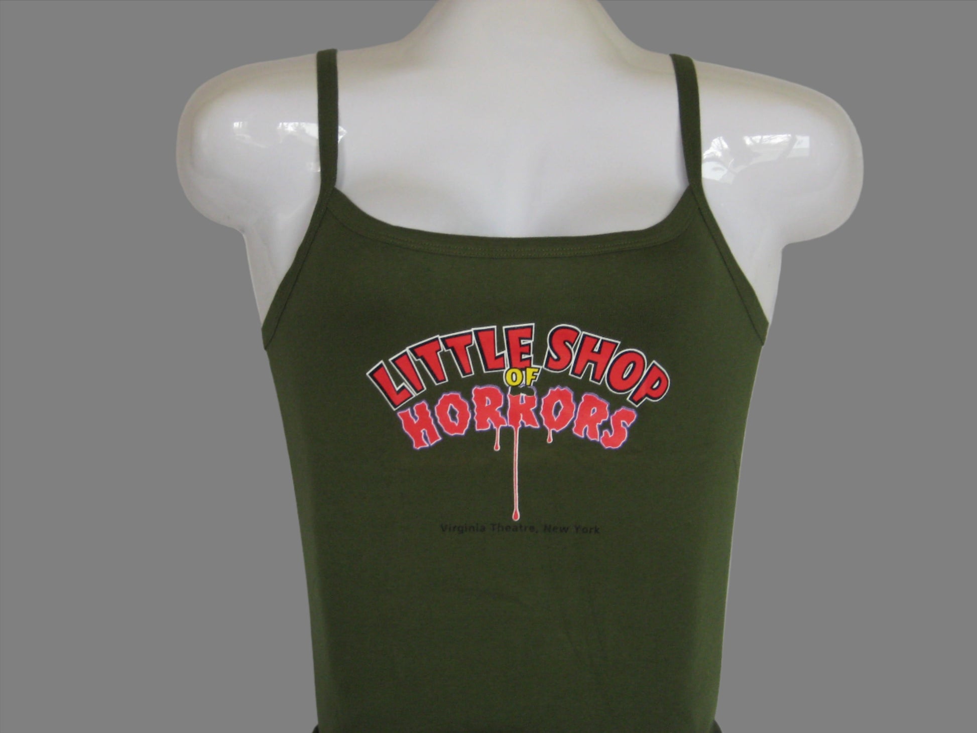 This is a ladies Pine colored tank top from the production run of the Little Shop of Horrors at the Virginia Theatre in New York. The tank top is made of a lightweight, breathable fabric that is perfect for hot summer days.